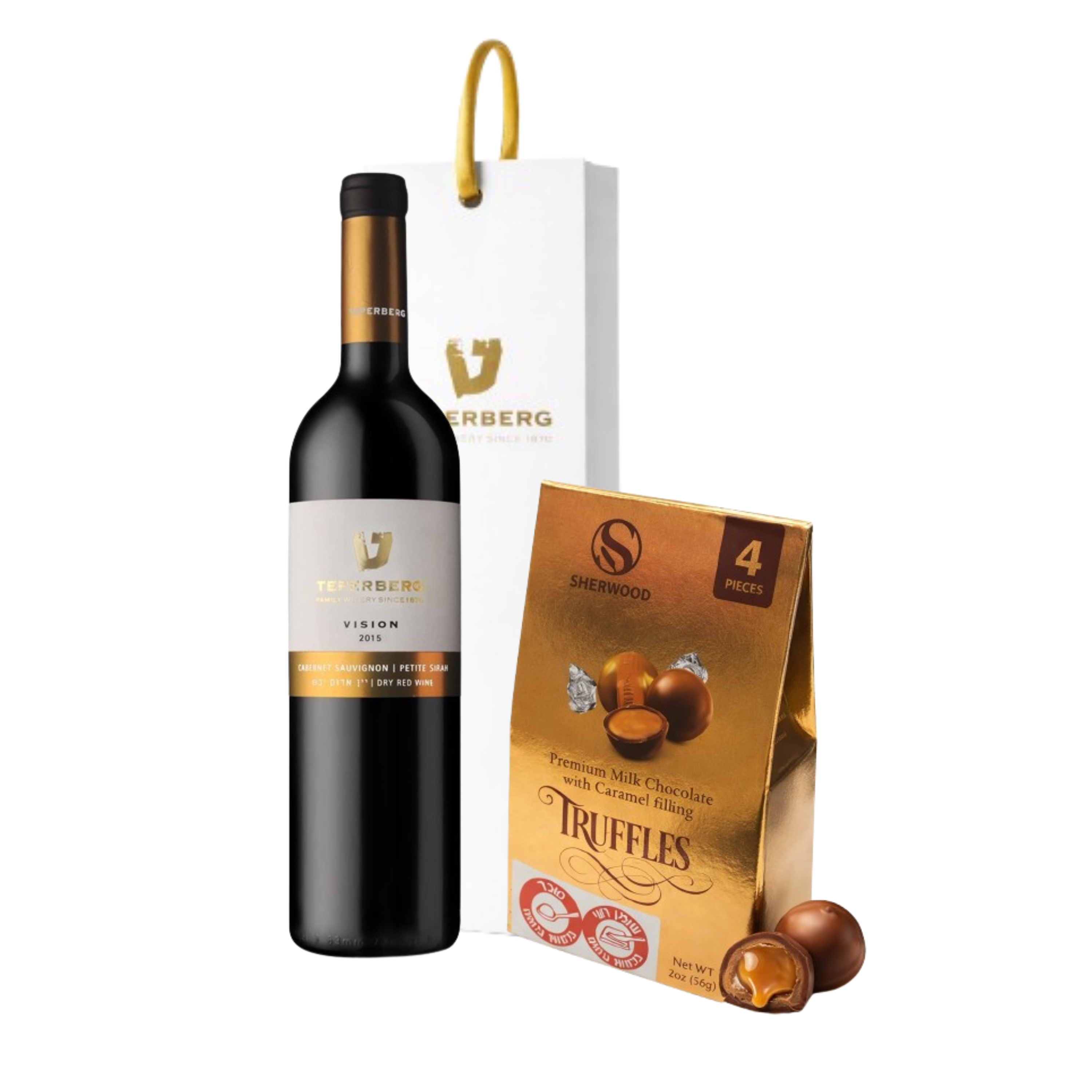 המארז כולל בקבוק טפרברג Vision קברנה סוביניון פטיט סירה בנפח 750 מ"ל מבית יקב טפרברג, אחד היקבים הוותיקים והמוערכים בישראל. לצד היין מצורף מארז שוקולד חלב ממולא קרם בטעם כרמל במשקל 56 גרם, להשלמת חוויית אירוח מפנקת.