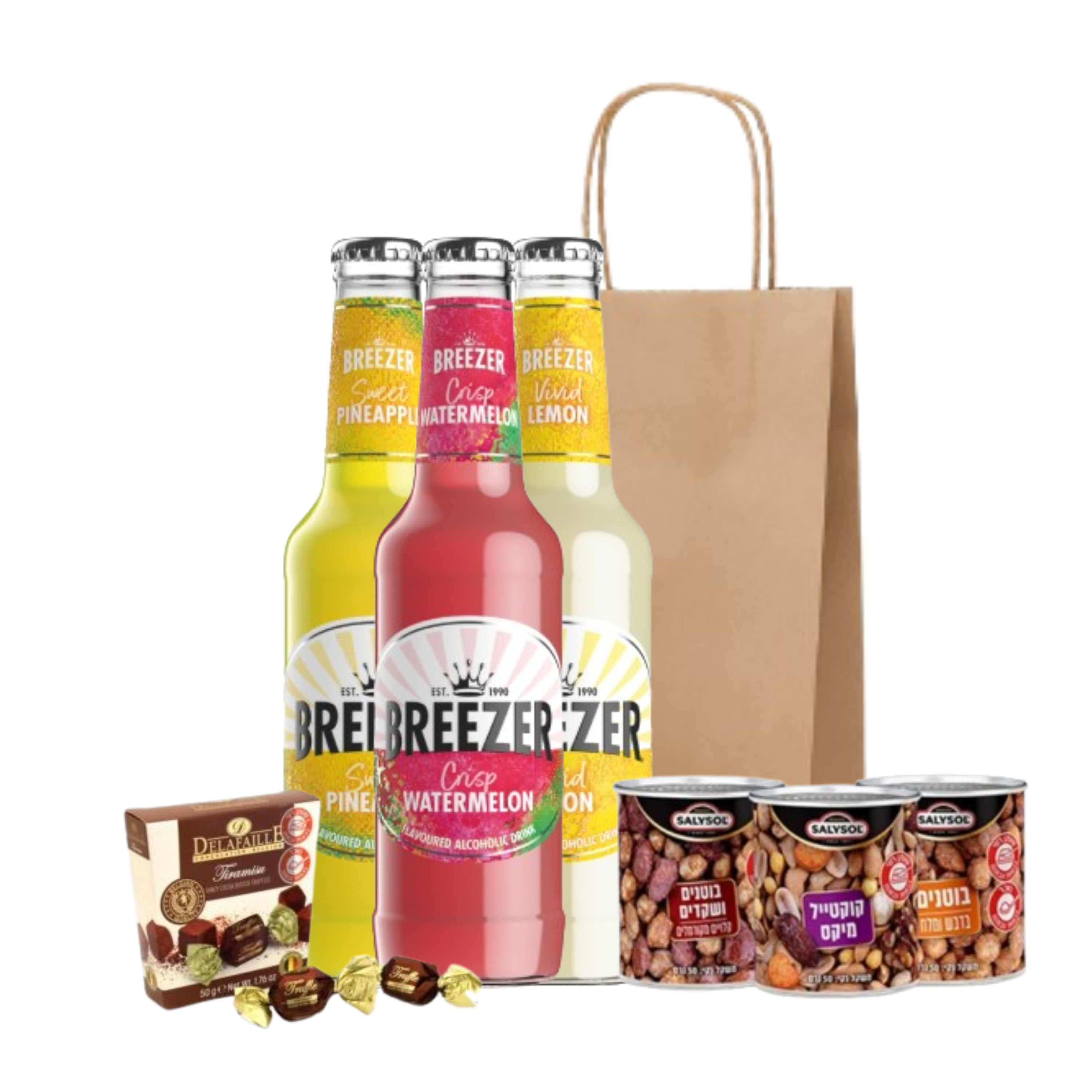 מארז מתנה קליל ושמח הכולל משקאות בריזר בטעמים יחד עם פיצוחים ושוקולד בלגי איכותי – שילוב מושלם לפינוק, לאירוח או כמתנה לעובדים וללקוחות בתקופת החגים.