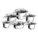 סט בישול 12 חלקים מנירוסטה בגימור מבריק, עם תחתית 5 שכבות לפיזור חום אחיד ובישול חסכוני באנרגיה. כולל מכסי זכוכית מחוסמת עם פתח לאדים וסקאלת מדידה פנימית. מתאים לכל סוגי הכיריים כולל אינדוקציה ולמדיח כלים.