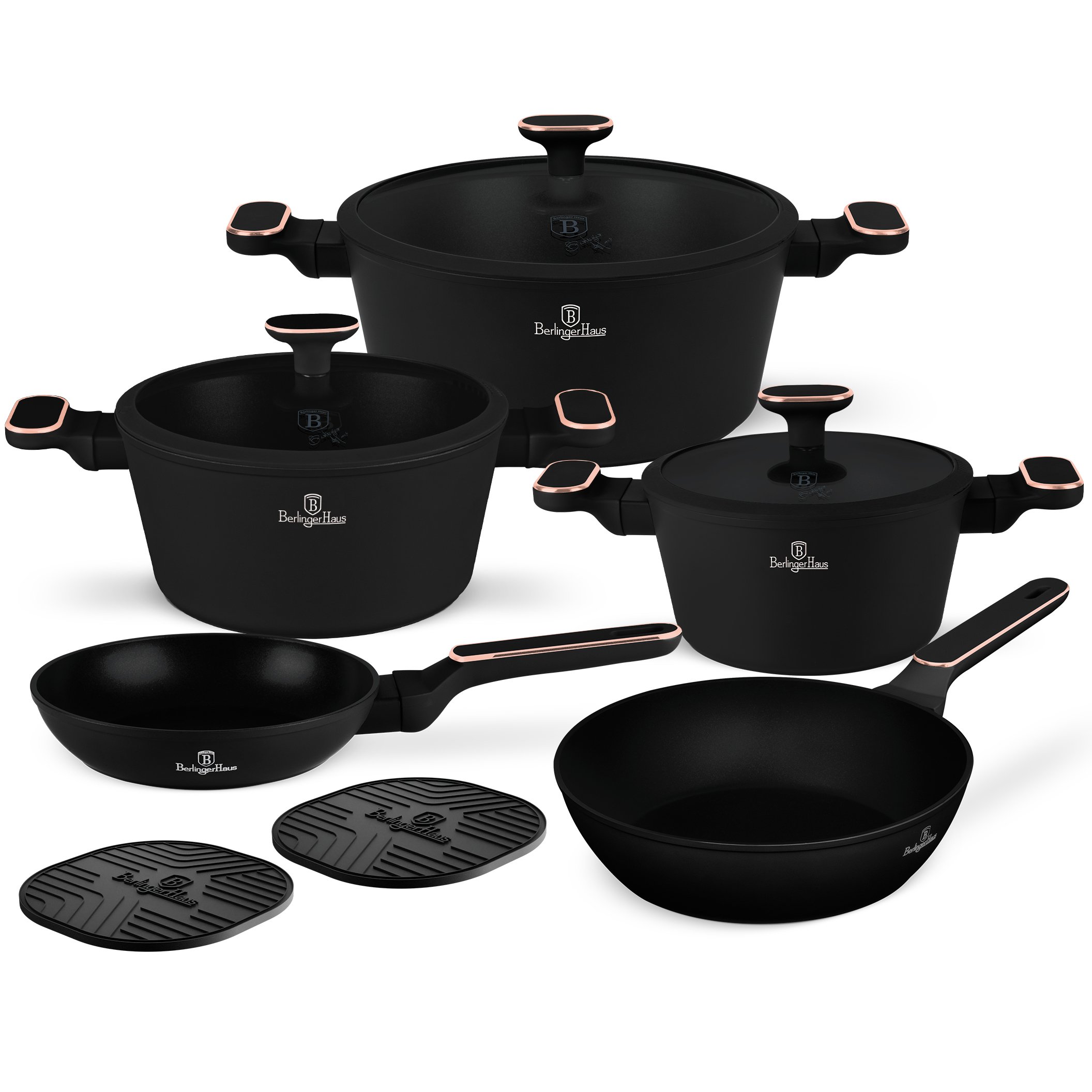 סט סירים ומחבתות 10 חלקים מבית BERLINGER HAUS משלב עיצוב יוקרתי עם ביצועים גבוהים במטבח. הסט מגיע בגימור שחור מט אלגנטי עם נגיעות מתכת בגוון רוז גולד בידיות ובמכסים, מה שמעניק לו מראה מודרני ומרשים.
