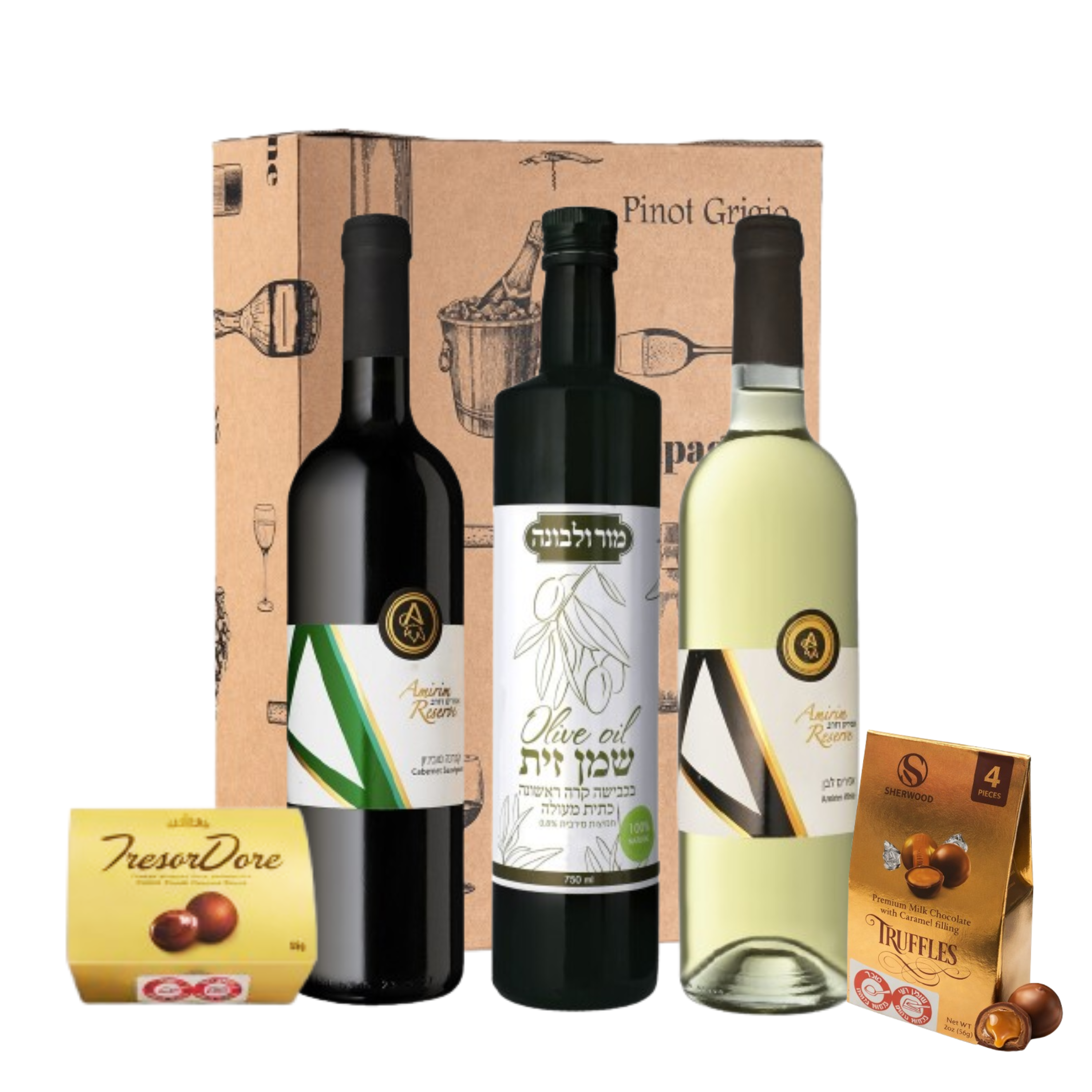 מארז יין ושמן זית יוקרתי עם פרלינים