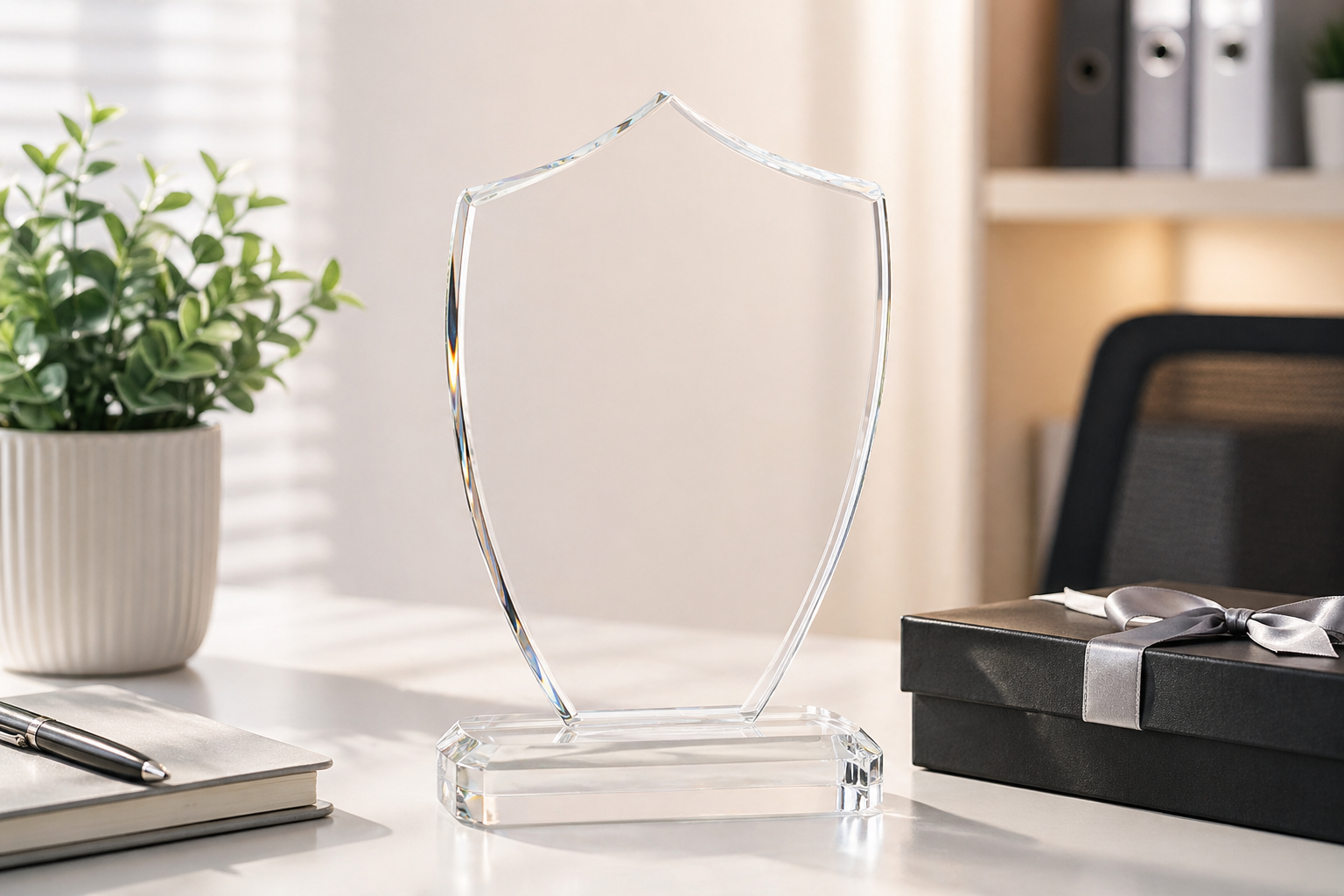 מגן הוקרה יוקרתי מזכוכית קריסטל בעיצוב נקי ומודרני.