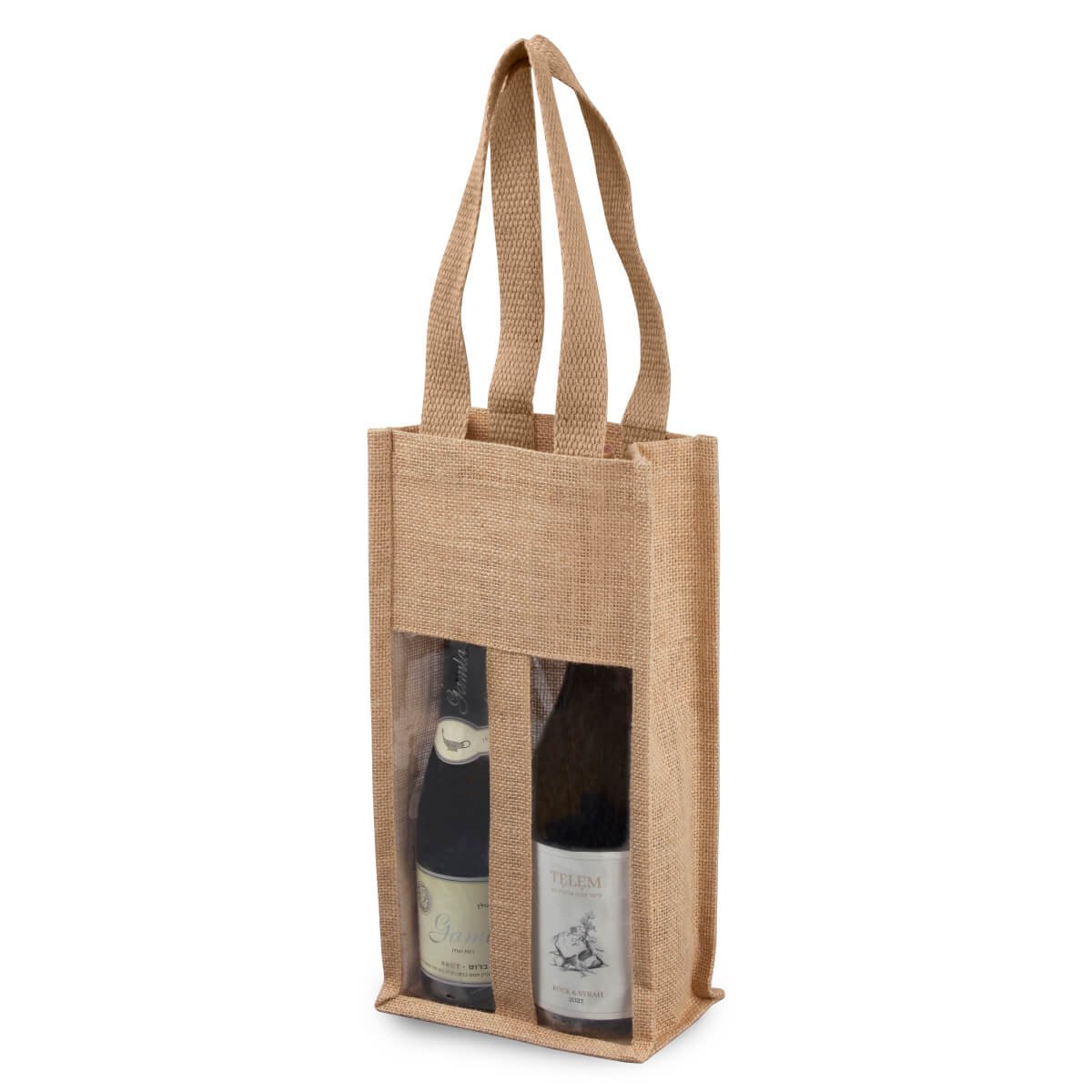 תיק מיוטה טבעית עם חלון שקוף ל־2 בקבוקי יין – מתנה אלגנטית לחג, עם אפשרות למיתוג אישי ולוגו חברה.